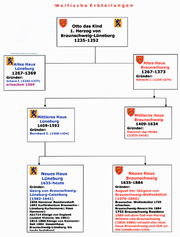 1267/1269 wurde das Herzogtum von seinen Söhnen geteilt (Zweite welfische Landesteilung): Johann I. (1242-1277) erhielt das Lüneburger Land mit der Stadt Hannover und wurde so zum Gründer des Alten Hauses Lüneburg.